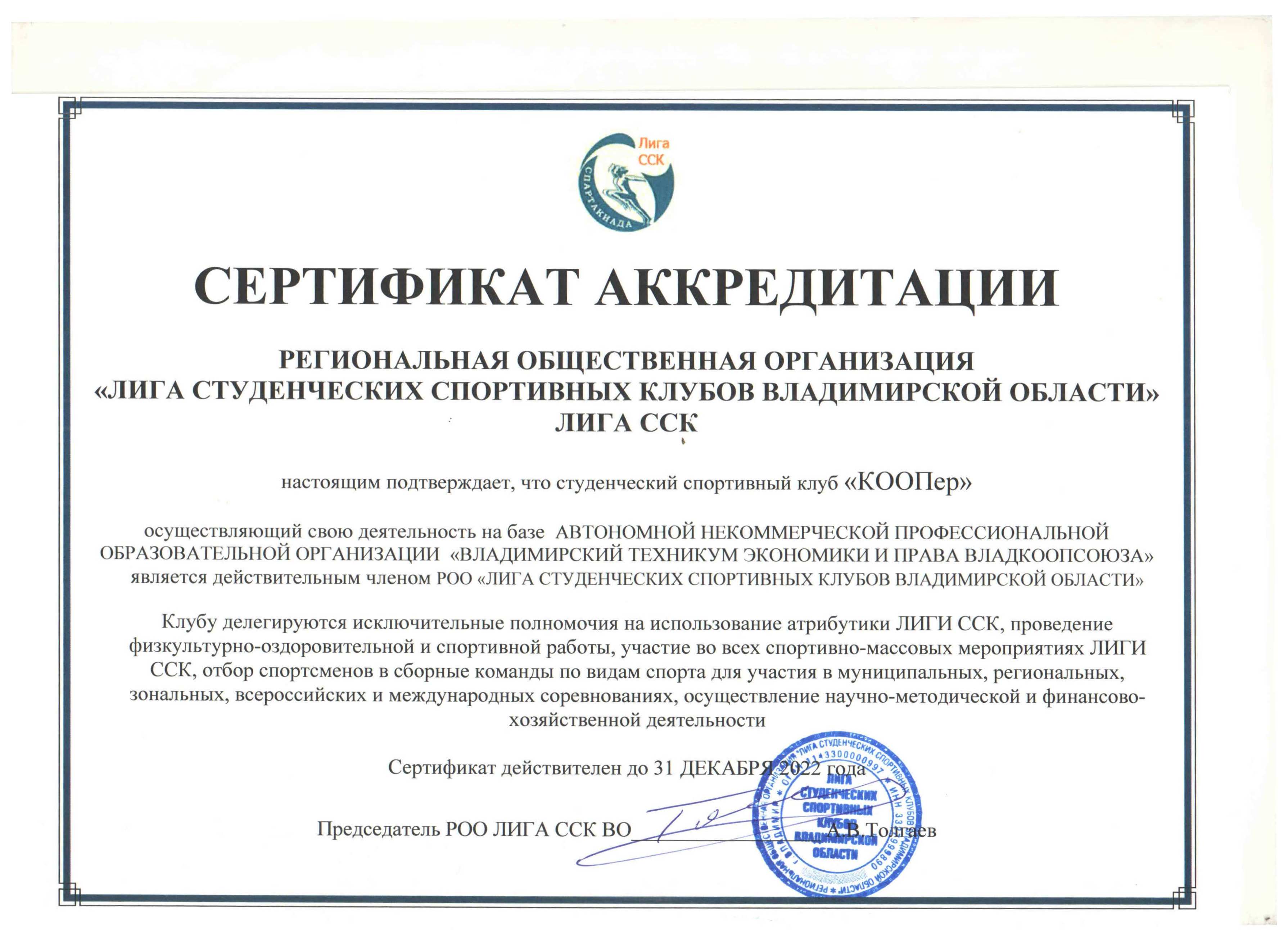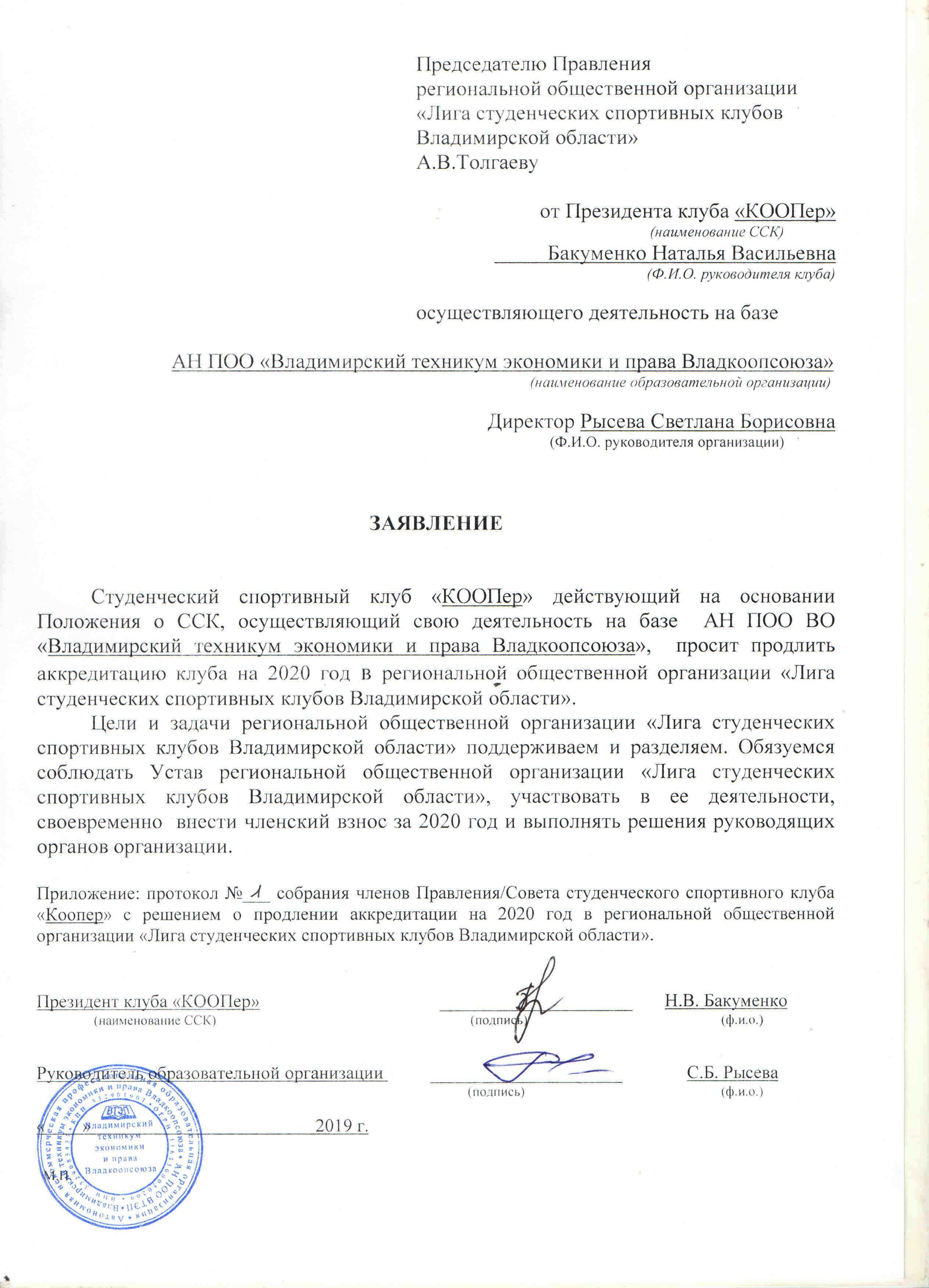 Заявление о продлении аккредитации клуба в РОО "Лига студенческих спортивных клубов Владимирской области"