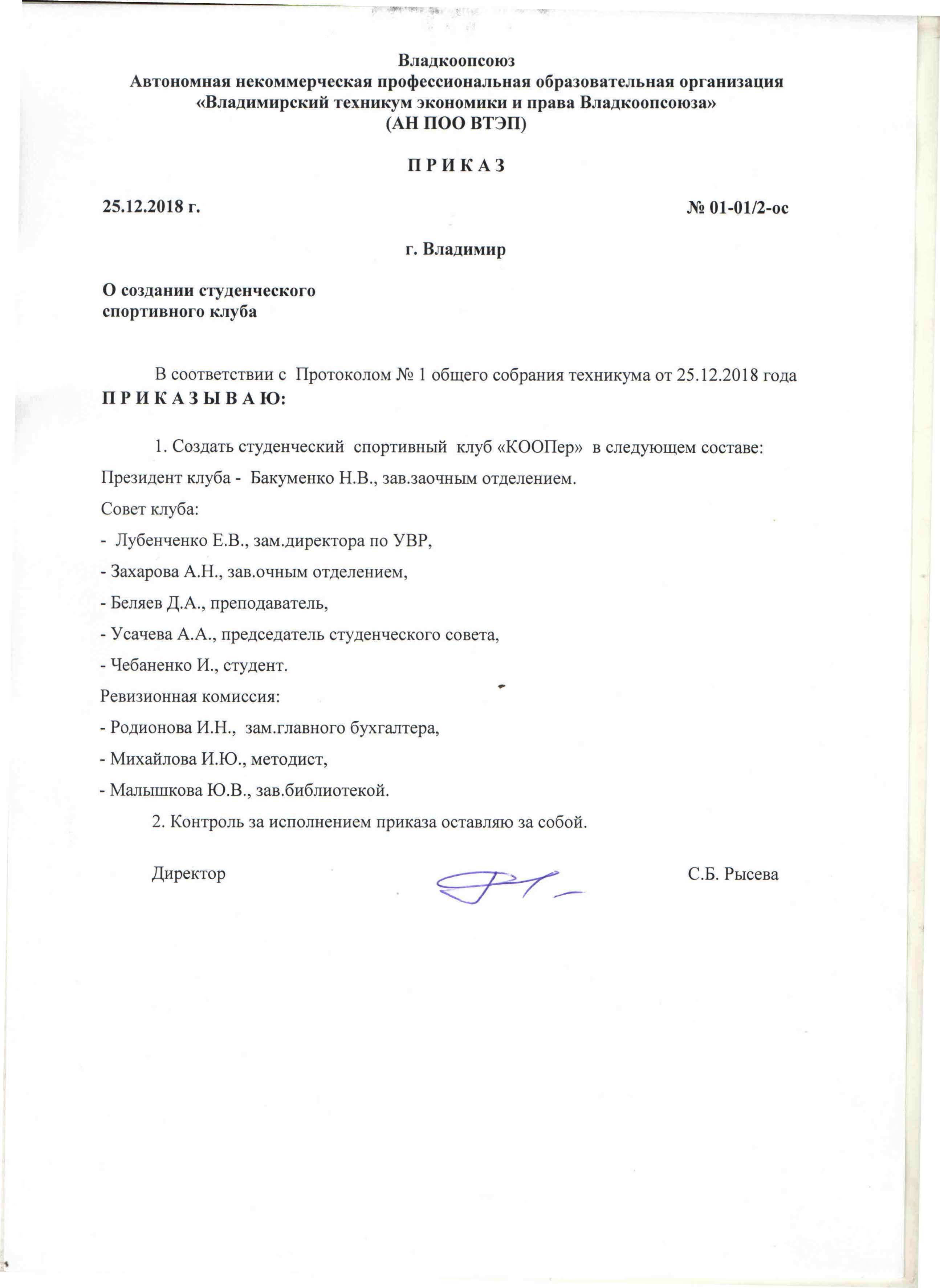 Приказ о создании студенческого спортивного клуба "КООПер"