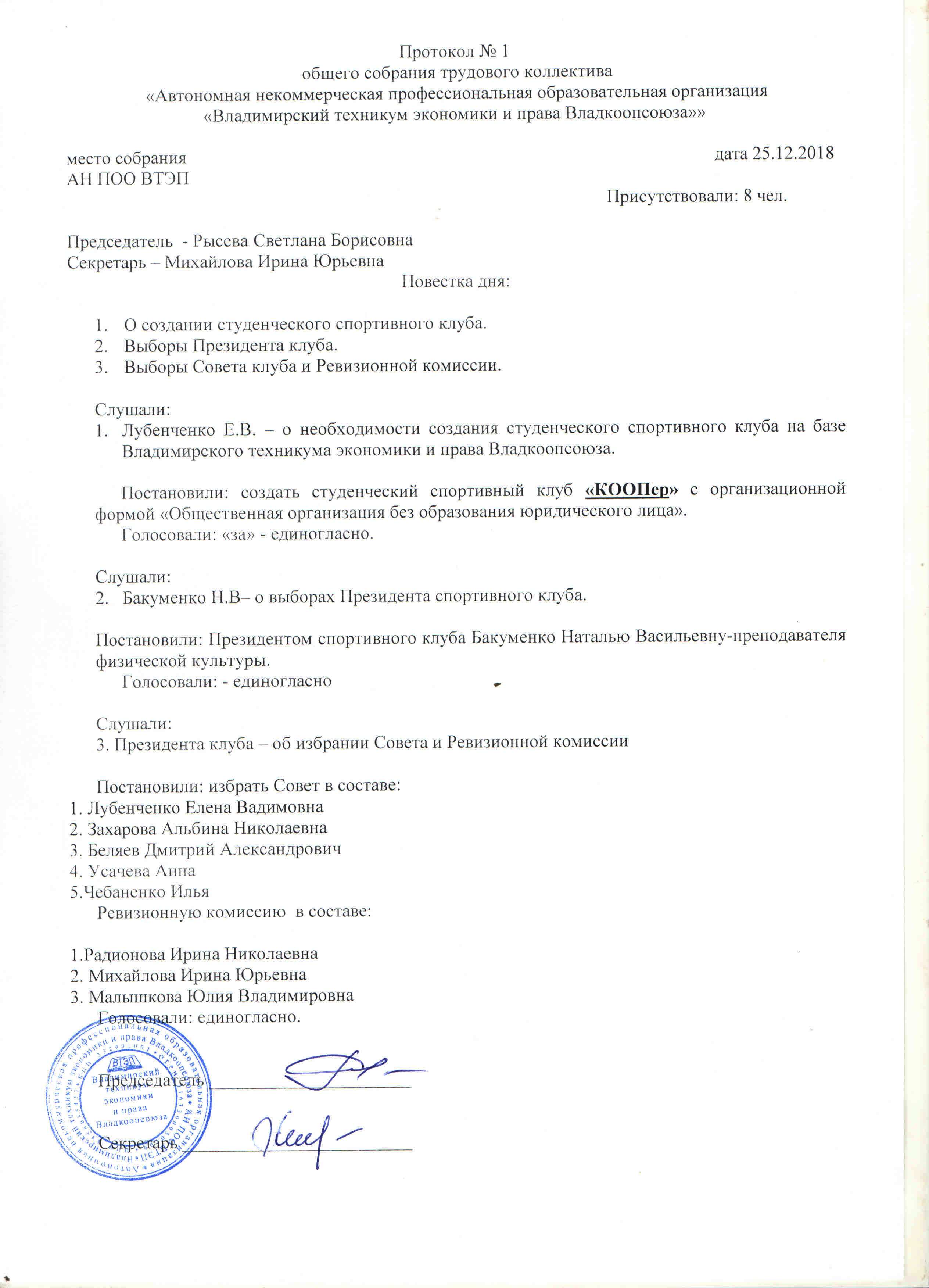 Протокол общего собрания АН ПОО ВТЭП о создании студенческого спортивного клуба