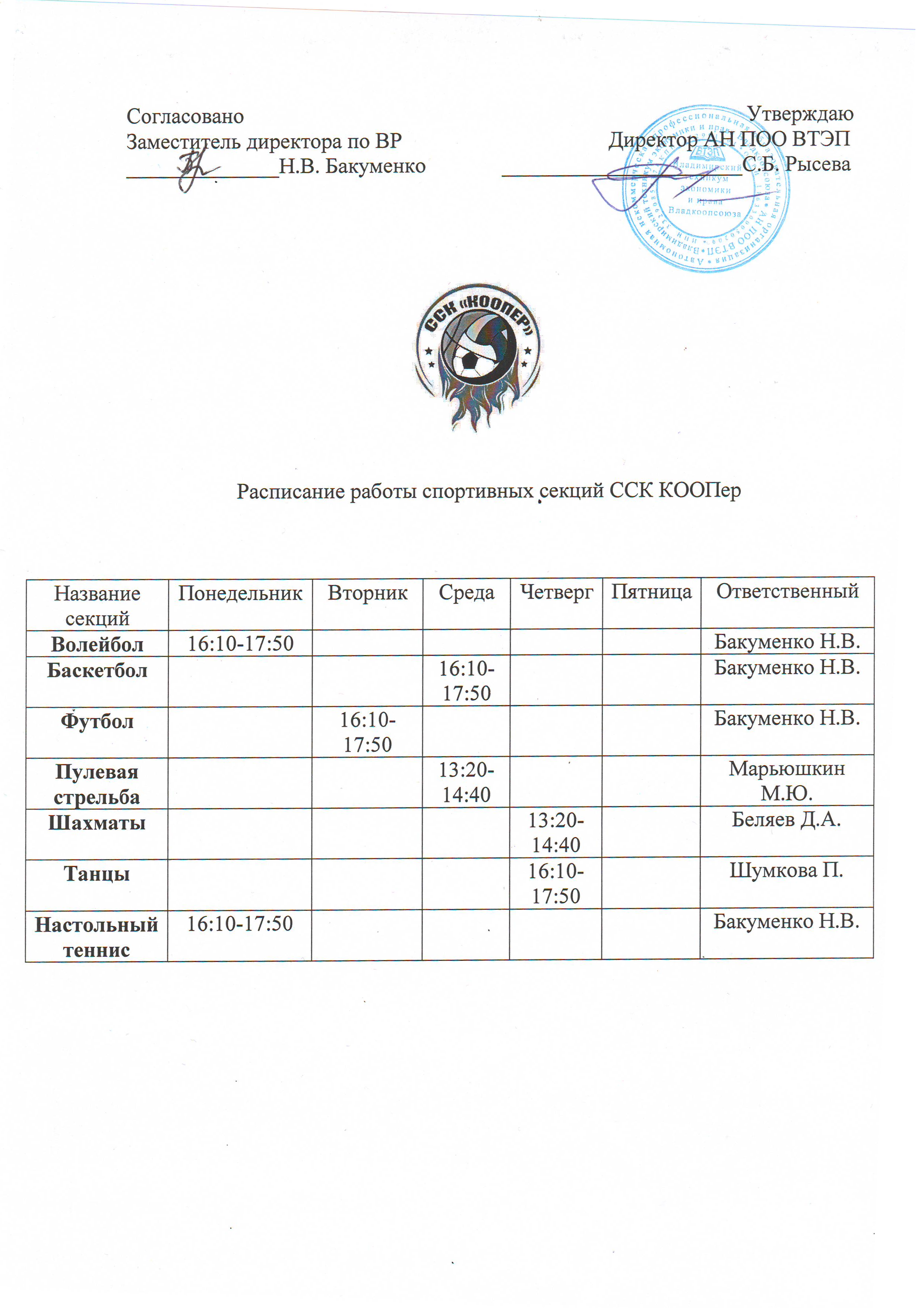 Расписание работы спортивных секций в студенческом спортивном клубе "КООПер" на 2025-2026 учебный год
